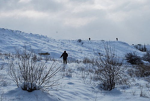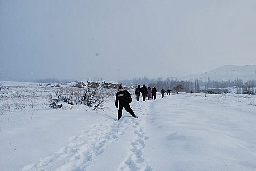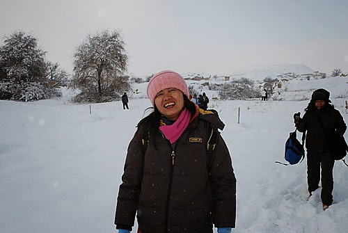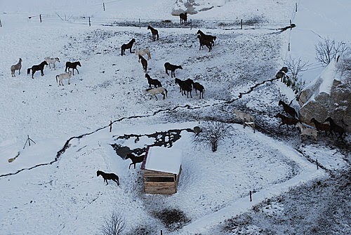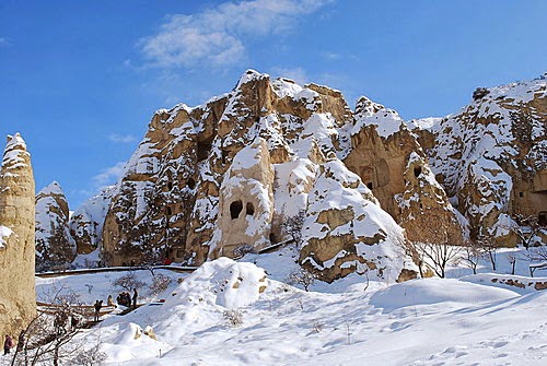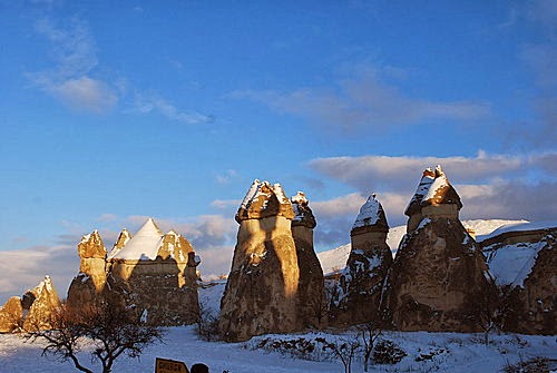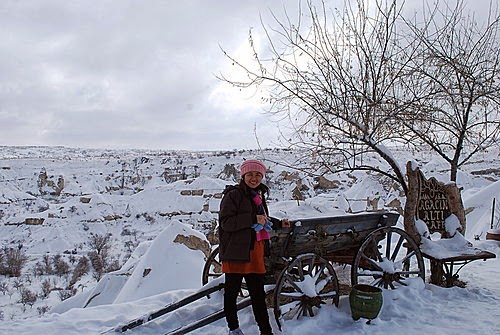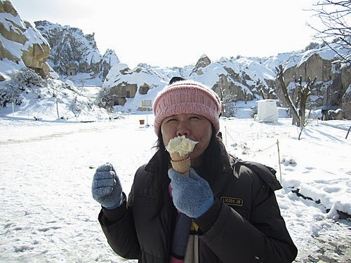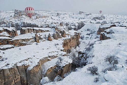 俯瞰皚皚白雪中的卡帕多其亞,懷著興奮的心情,出發了!歡樂之後總是伴隨著災難,才高興沒多久,竟然碰上的是菜鳥駕駛員,不僅無法靠近仔細欣賞岩壁風光,降落時更是在狗不拉屎、鳥不生蛋的冰天雪地的荒野,唉啊!難道我們必須在此等候救難人員嗎?寒風刺骨中總算盼到有人跑來,