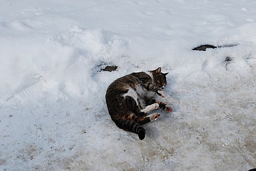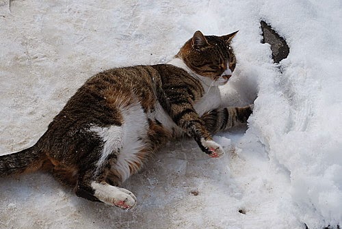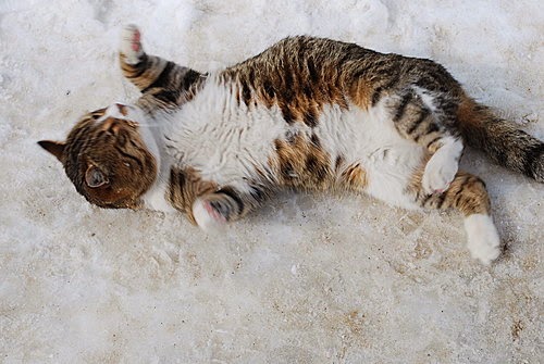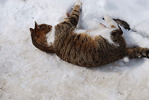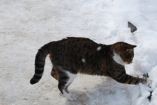 雪地上嬉戲的貓。