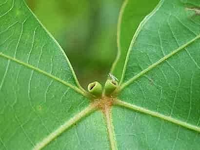 ,脈網顯著。 葉基有一對杯狀腺體, 具吸引螞蟻、蜜蜂、蝴蝶等昆蟲的功能。 |